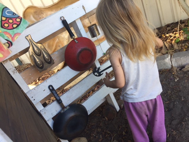 During our April Holidays we created a sound wall next to Dancing Girl’s Cubby. I have always loved sound walls and it is a great way to recycle broken bits and pieces from the kitchen that make great bangs, scrapes, tingles or thuds. Colanders or strainers are particularly fun to scrape.